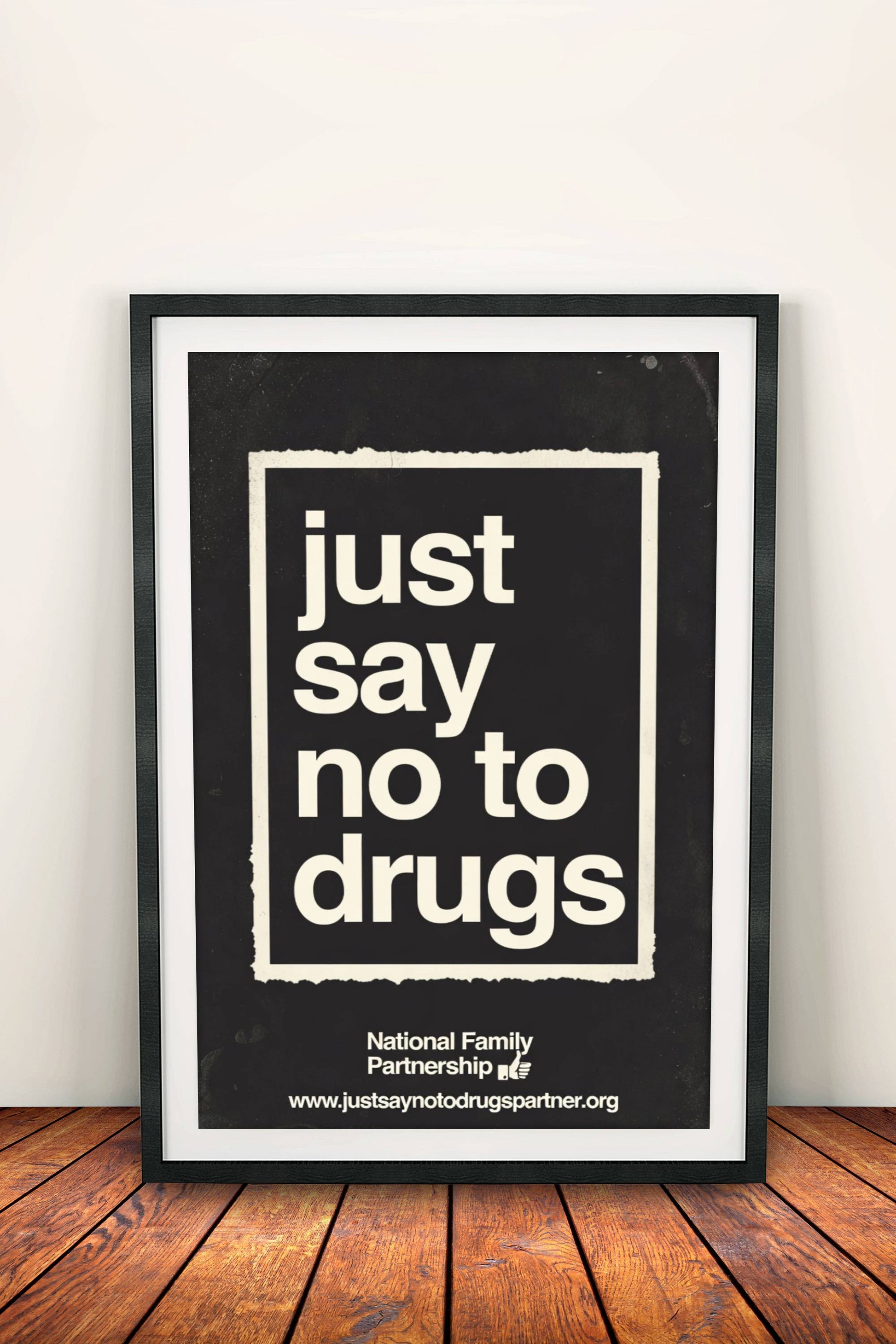 A strong retro warning poster on a black background: large white "JUST SAY NO TO DRUGS" text in a dramatic font, with the National Family Partnership logo and website below - the worn vintage paper look brings the 80s-90s campaign vibe.