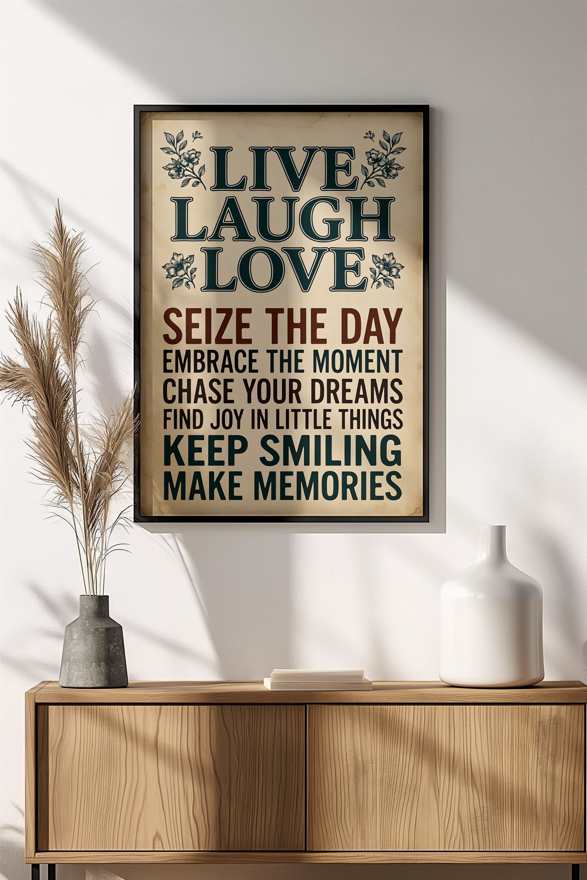 An inspiring retro vintage poster about the joy of life: "Live Laugh Love" and an invitation to seize the moment, smile and make memories. The patinated background and decorative leaves bring warmth to the bedroom, living room, cottage or as a gift. Perfect for a positive retro interior and everyday cheer.