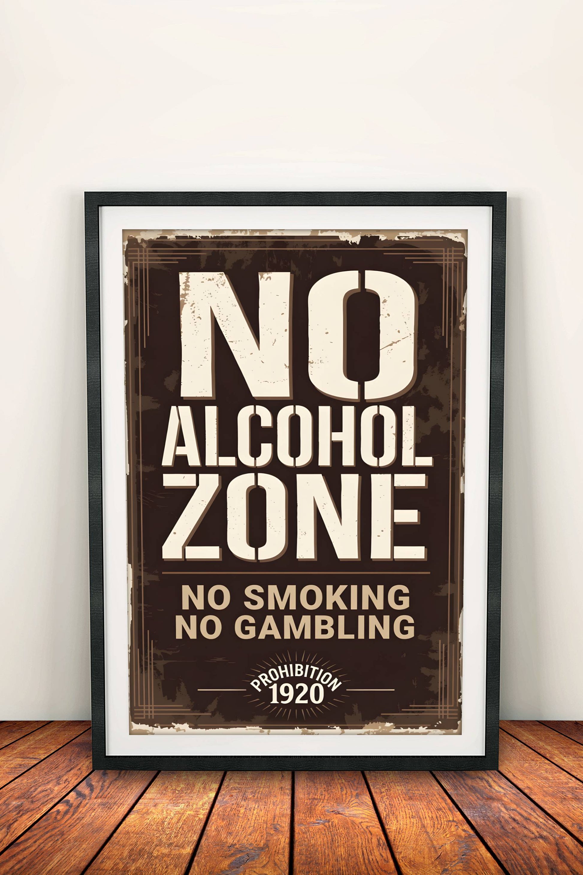 Classic retro prohibition poster with a worn paper look: large black "NO ALCOHOL ZONE" text, "NO SMOKING NO GAMBLING" and "PROHIBITION 1920" inscription below, dark brown background and jagged edges - a strict 1920s atmosphere.