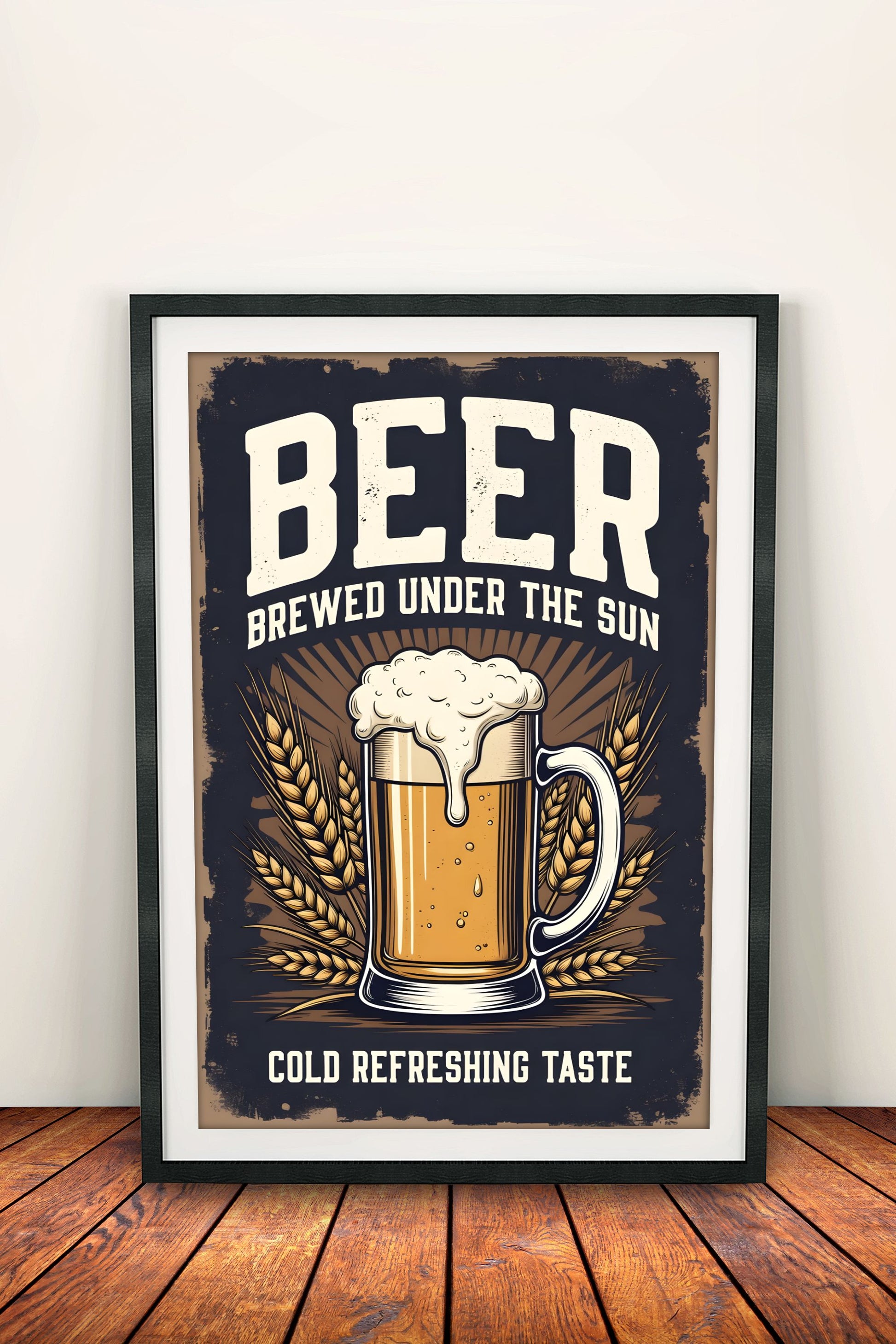 Raikas retro vintage -juliste oluesta: "Beer – Brewed Under the Sun" ja täyteläinen oluttuoppi humalalla ja vaahdolla. Tuo rentoa pubi- ja kesätunnelmaa keittiöön, baariin, mökille tai olohuoneeseen. Täydellinen oluenystävälle ja klassiseen retro-sisustukseen – nostattaa janon!