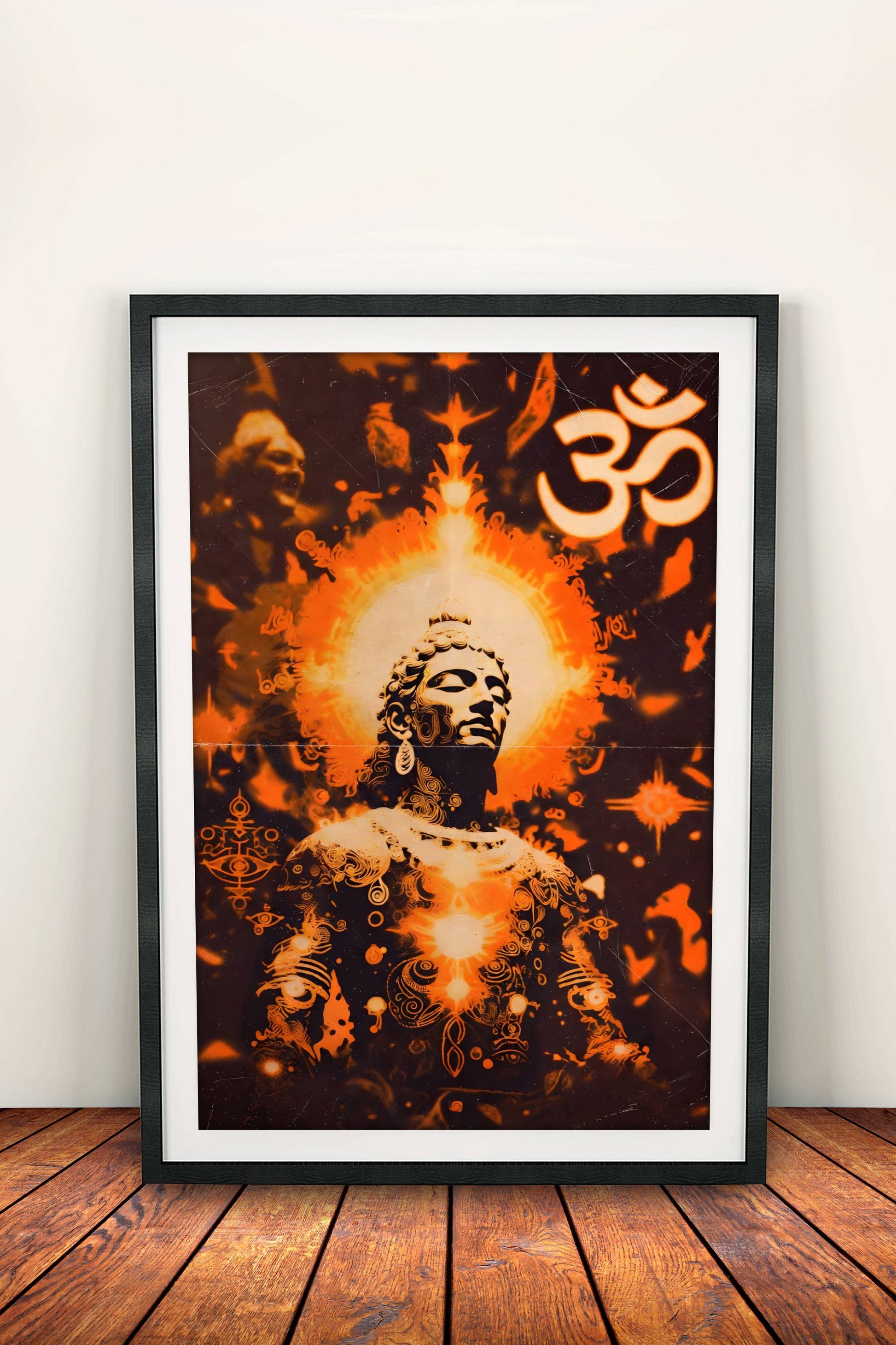 Voimakas retro-tyylinen buddhalainen juliste kuluneella paperi-ilmeellä: Buddha-kuva oranssissa hehkussa, iso "ॐ" (Om) -symboli ylhäällä, taustalla säteilevä aura, silmiä ja monimutkaisia kuvioita – tumma tausta ja kultaisen oranssi värimaailma luovat 70-luvun psykedeelisen ja spirituaalisen tunnelman.
