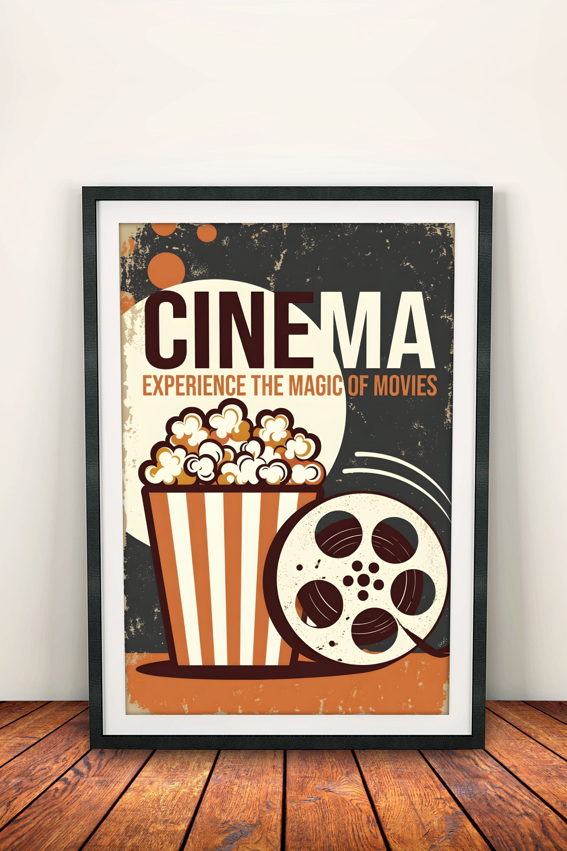 Nostalginen retro-vintage elokuvajuliste popcorn-ämpärin ja filmikelan kera. Teksti "Cinema – Experience the Magic of Movies" tuo vanhan ajan leffateatterin tunnelmaa – ihana seinätaide kotiteatteriin, olohuoneeseen tai elokuvafanin kotiin tuomaan elokuvien taikaa ja 50-60-luvun charmia.