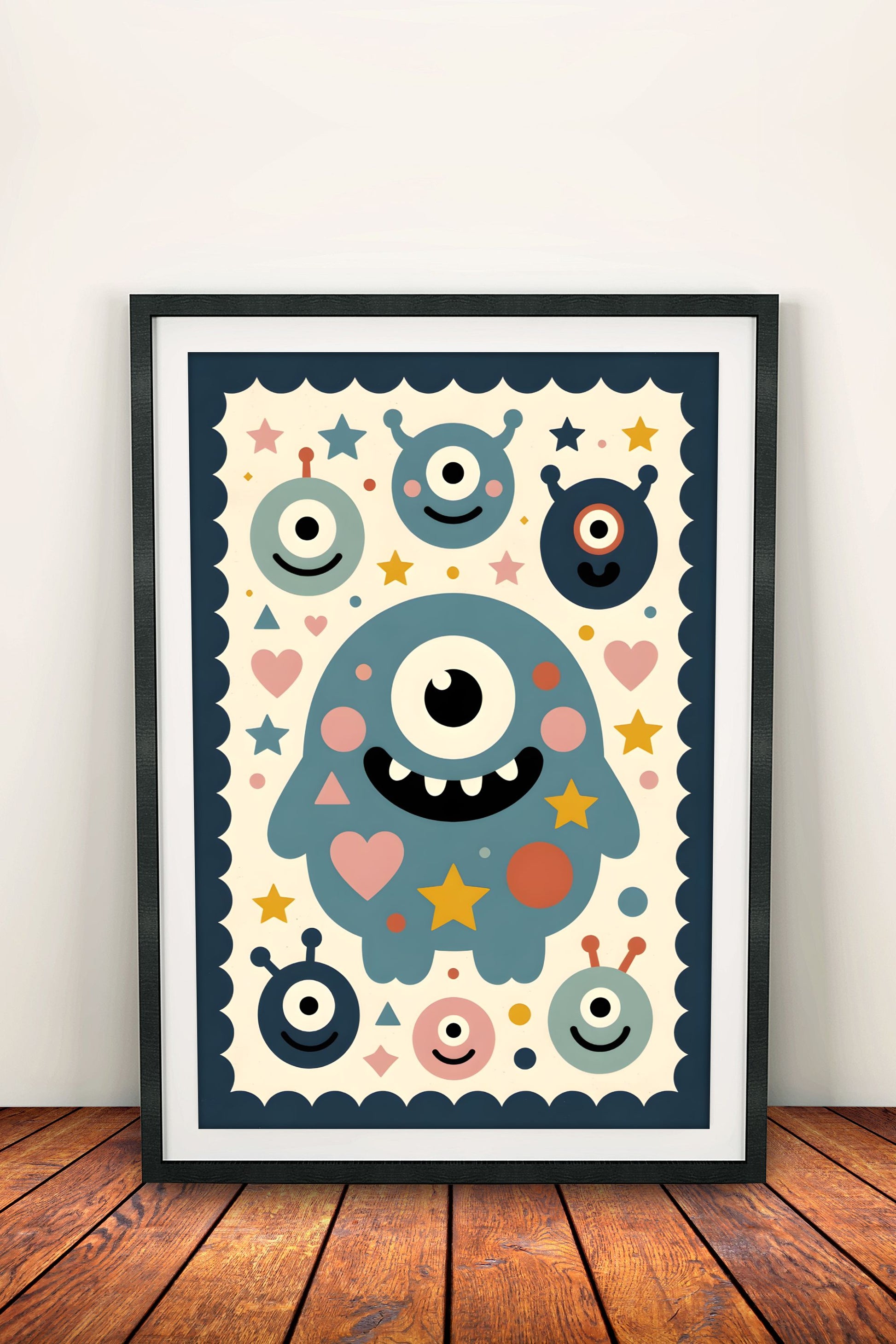 Iloinen retro vintage -juliste söpöistä hirviöistä: suuri hymyilevä monsteri ja pienet kaverit tähtien, sydämien ja värikkäiden muotojen ympäröimänä. Tuo leikkisää ja lämminhenkistä tunnelmaa lastenhuoneeseen, päiväkotiin, mökille tai iloiseen nurkkaan. Täydellinen piristys retro-sisustukseen tai lahjaksi lapselle.