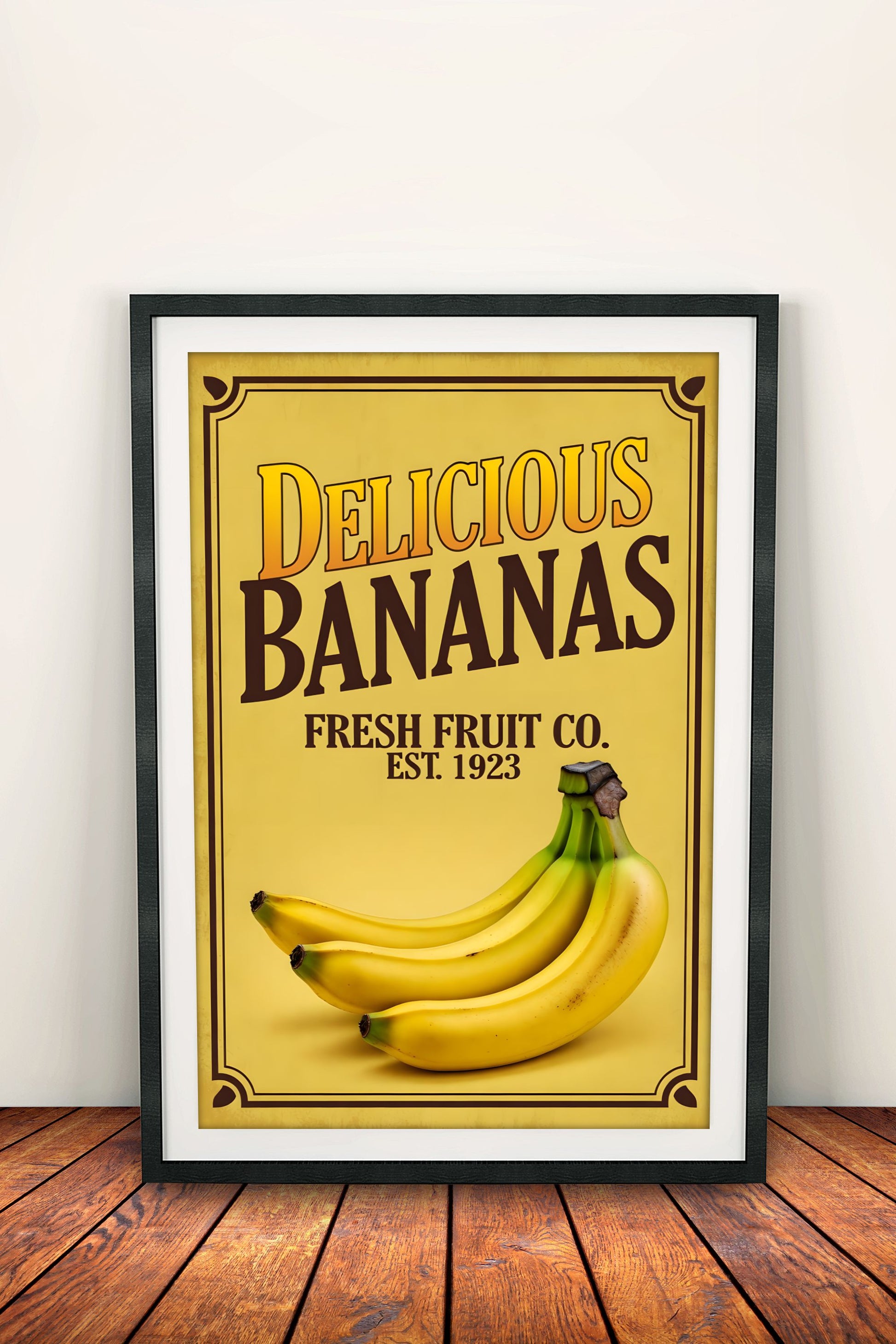 Klassinen retro-mainosjuliste tuoreista banaaneista: iso keltainen "DELICIOUS BANANAS" -teksti, kypsät banaanit klassisella Fresh Fruit Co. -logolla ja EST. 1923 -merkinnällä, lämpimässä kelta-ruskeassa vintage-tyylissä.