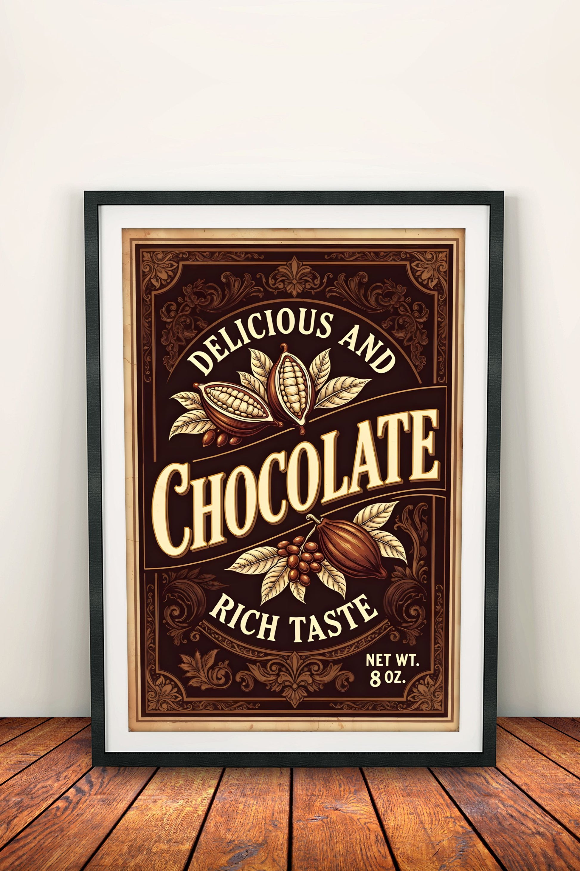 Herkullinen retro vintage -juliste suklaasta: "Delicious and Chocolate – Rich Taste" kauniilla kaakaopavuilla ja koristeellisella kehyksellä. Tuo lämpimää, makeaa tunnelmaa keittiöön, kahvihuoneeseen, mökille tai suklaafanin nurkkaan. Klassinen ja houkutteleva retro-tyyli – täydellinen lahjaksi tai sisustukseen.