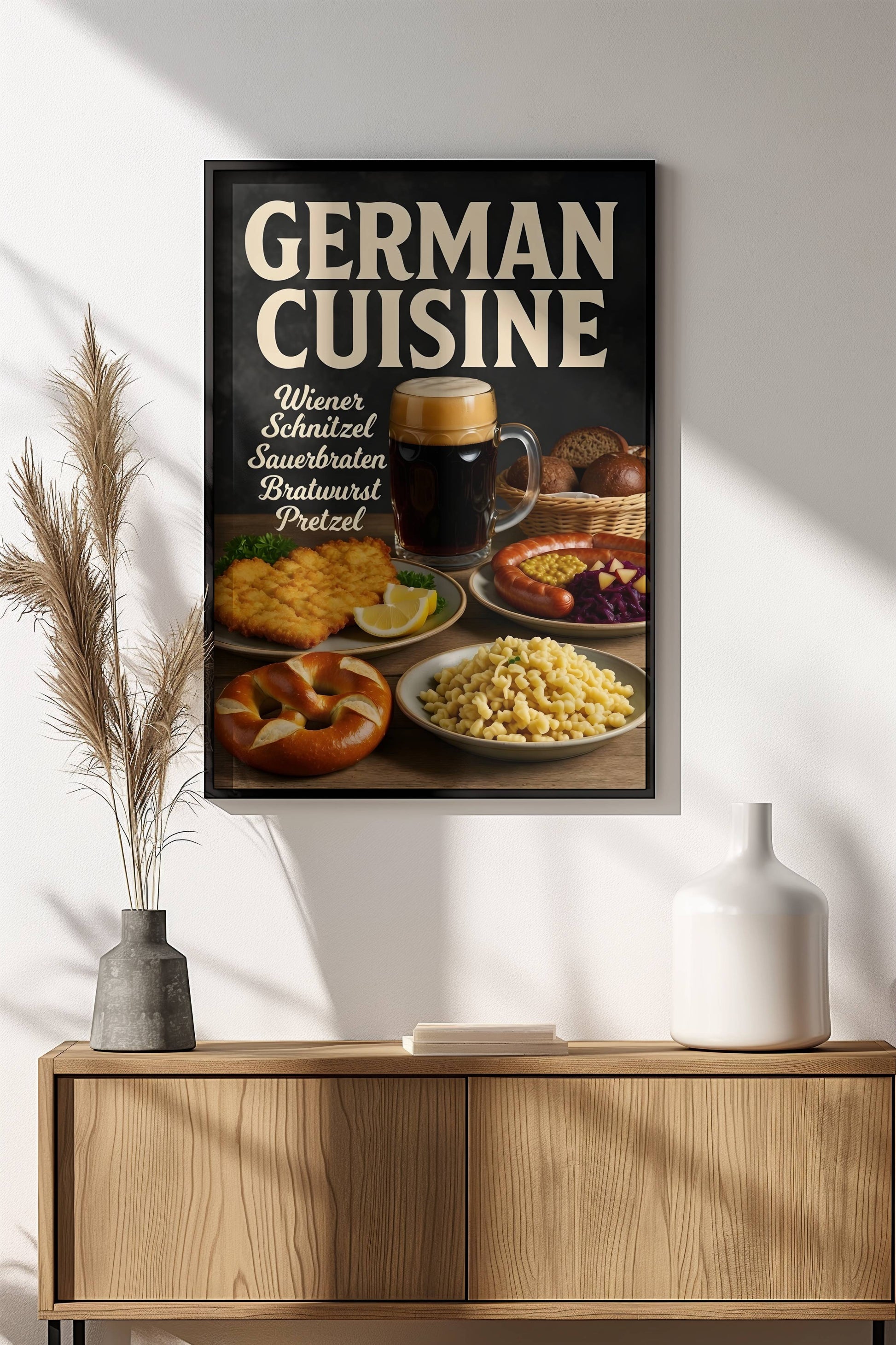 Tunnelmallinen retro-tyylinen saksalainen ruoka-juliste kuluneella paperi-ilmeellä: iso "GERMAN CUISINE" -teksti ylhäällä, alla Wiener Schnitzel, Sauerbraten, Bratwurst, pretzelit, oluttuoppi ja lisukkeita – lämpimät ruskean, kullan ja tumman sävyt 50-luvun mainoshenkeen.