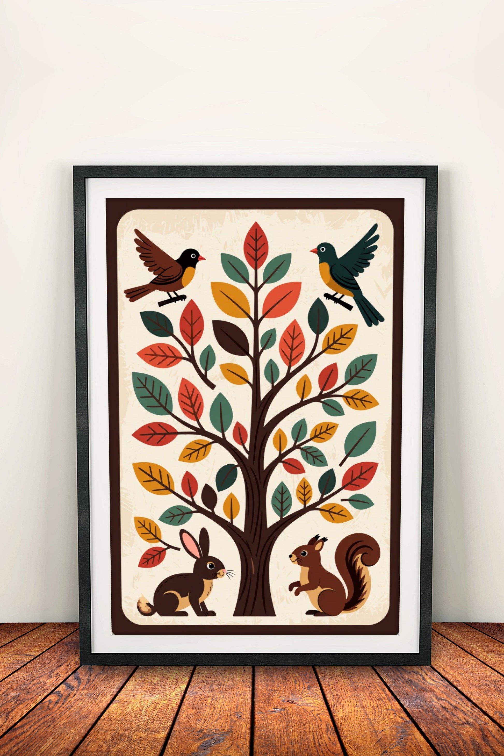 Suloinen retro-tyylinen lastenjuliste lämpimissä syksyisissä sävyissä: iso puu värikkäine lehtineen, lintuja oksilla, pupu ja orava juurella – leikkisä ja kodikas tunnelma kuluneella paperi-ilmeellä.