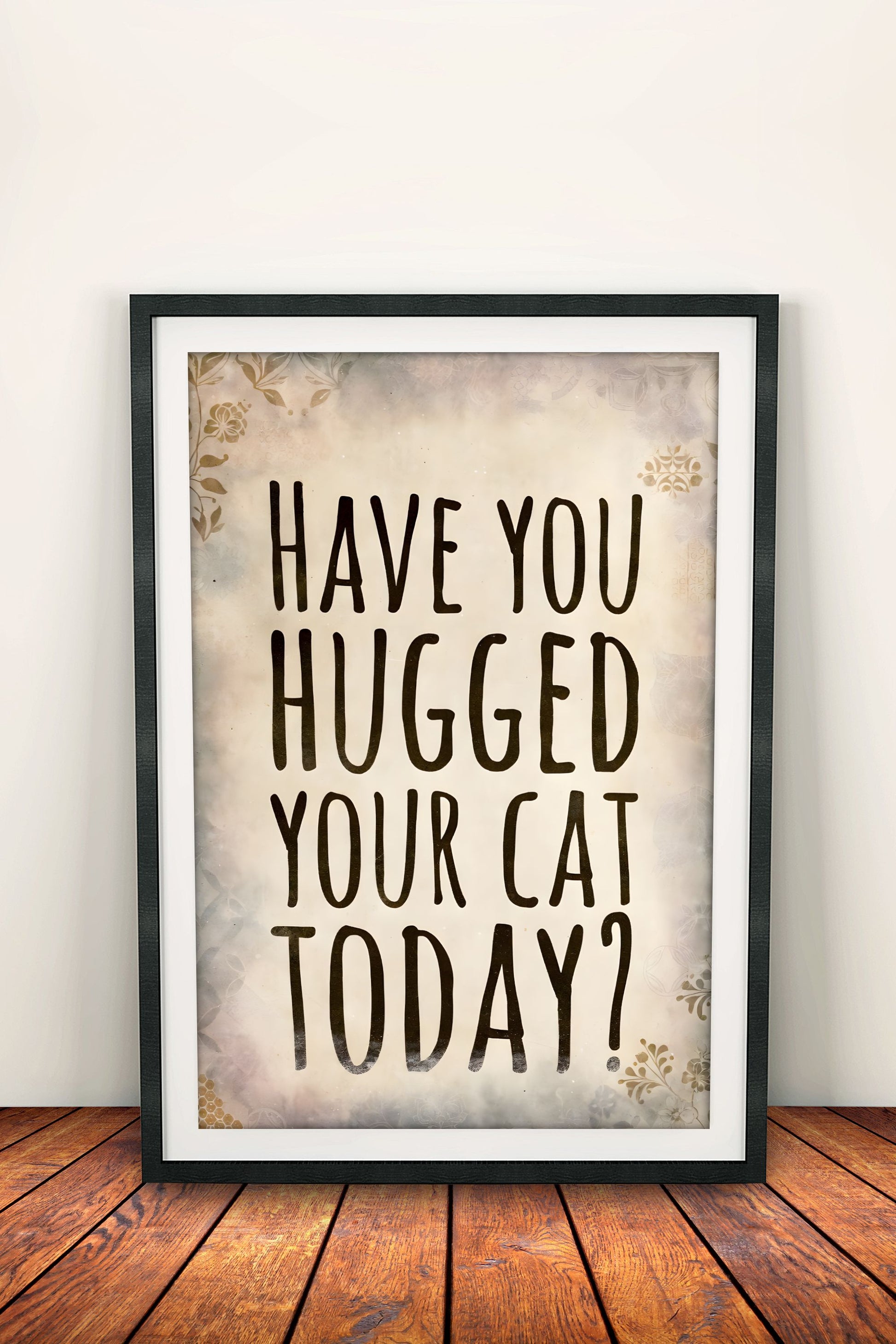Lämmin ja hauska retro vintage -juliste kissanystävälle: "Have You Hugged Your Cat Today?" tuo hymyä ja muistutusta rakkaudesta lemmikkiin. Vanhahtava patina ja kukkakuviot tekevät siitä täydellisen makuuhuoneeseen, olohuoneeseen, kissakahvilaan tai lahjaksi kissaihmiselle. Ihana piristys retro-sisustukseen!