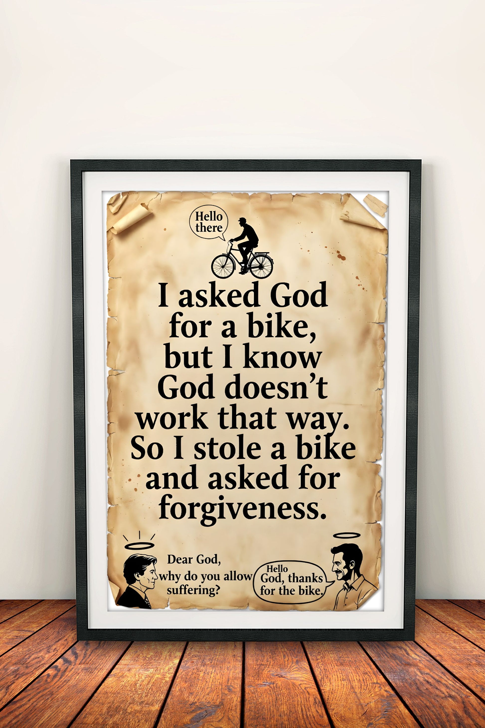 Hauska retro-vintage huumorijuliste vanhan paperin tunnelmalla. Pyöräilijä ja klassinen vitsi: "I asked God for a bike, but I know God doesn’t work that way. So I stole a bike and asked for forgiveness." – leikkisä ja ilkikurinen seinätaide makuuhuoneeseen, olohuoneeseen tai lahjaksi tuomaan hymyä ja 50-60-luvun nostalgiaa.