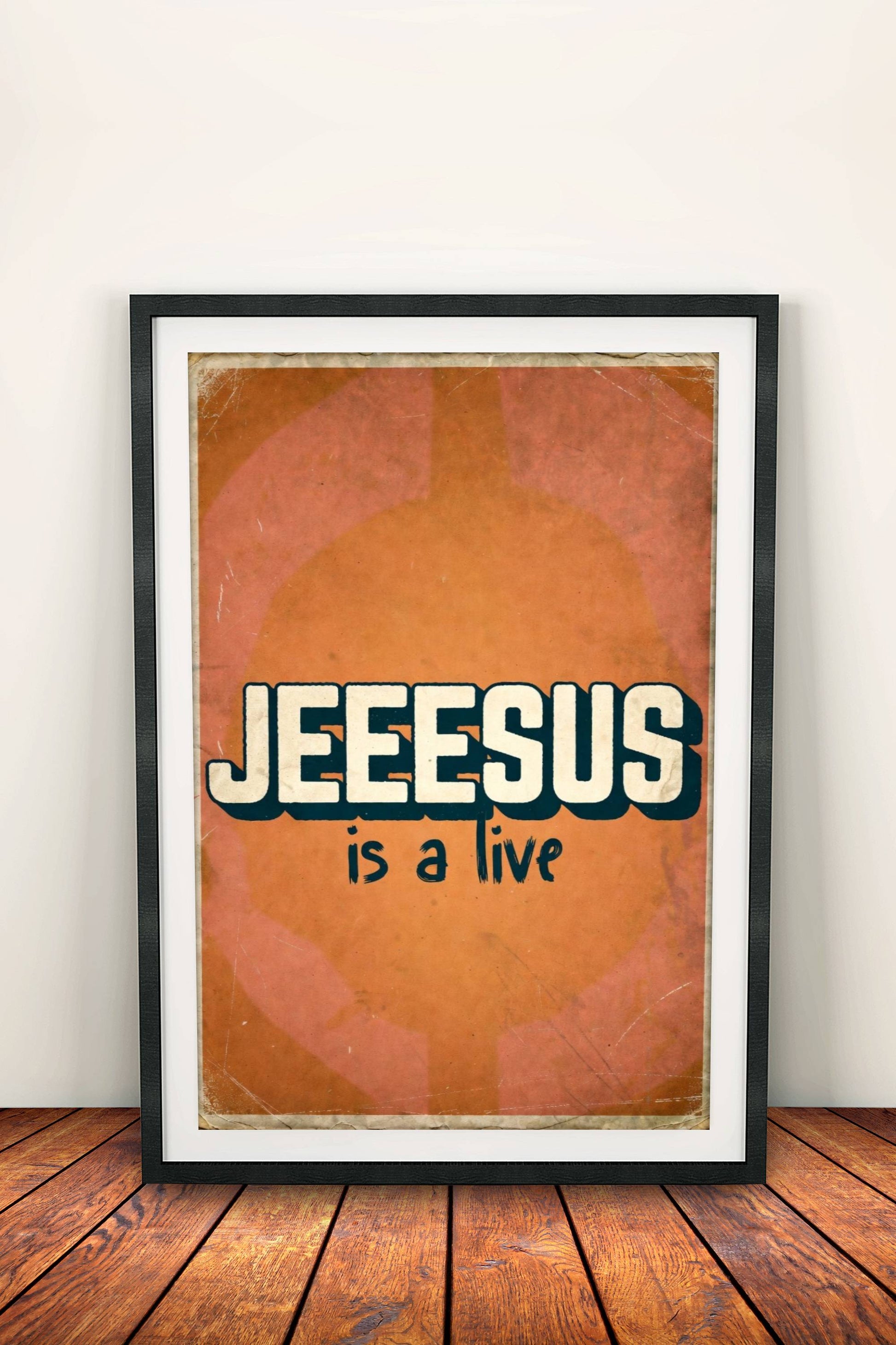 Voimakas retro-tyylinen hengellinen juliste lämpimässä oranssin ja ruskean sävyssä: iso rohkea "JEEESUS IS ALIVE" -teksti keskellä, kulunut vintage-paperi-ilme ja haalea tausta – yksinkertainen mutta vaikuttava uskon viesti.