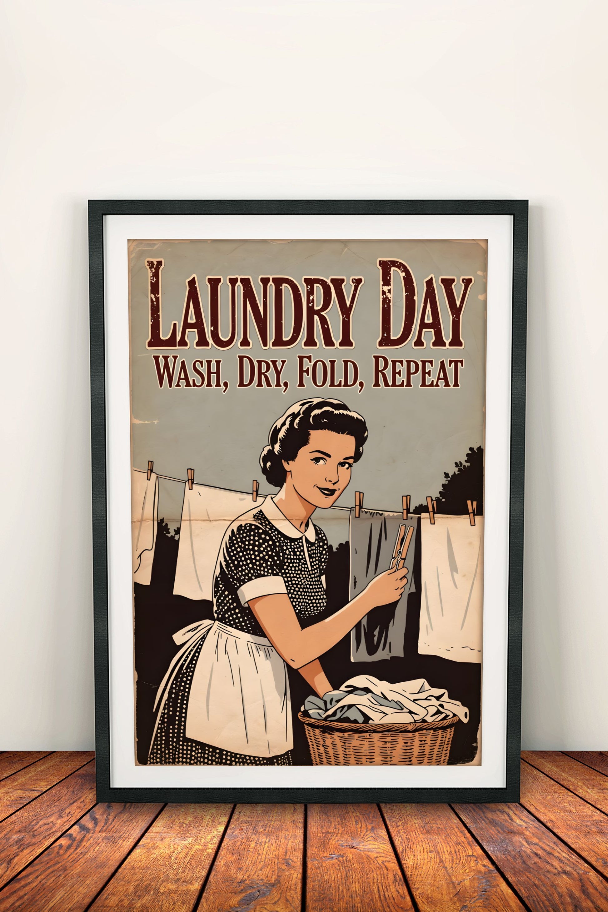 Hauska retro vintage -juliste pyykkipäivästä: hymyilevä 50-luvun kotiäiti pyykkikorin kanssa ja teksti "Laundry Day – Wash, Dry, Fold, Repeat". Patinoitunut tyyli tuo nostalgista charmia keittiöön, kodinhoitohuoneeseen, mökille tai lahjaksi. Täydellinen rentoon retro-sisustukseen ja arjen huumoriin.