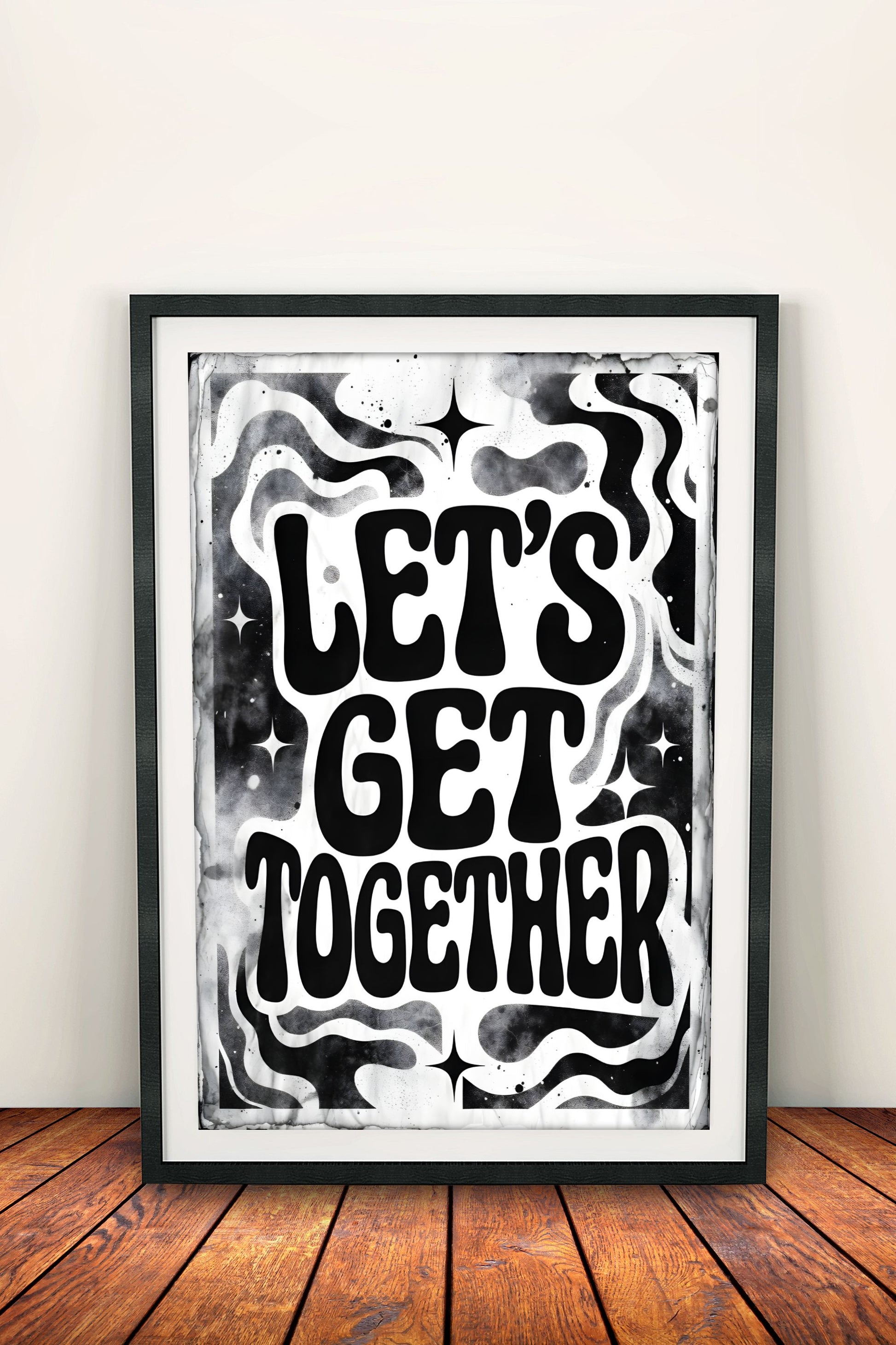 Leikkisä retro vintage -juliste yhdessäolosta: "Let's Get Together" aaltoilevassa tyylissä tähdillä ja patinalla. Tuo iloista 60-70-luvun tunnelmaa makuuhuoneeseen, olohuoneeseen, mökille tai ystävien nurkkaan. Täydellinen piristys rentoon retro-sisustukseen tai lahjaksi.