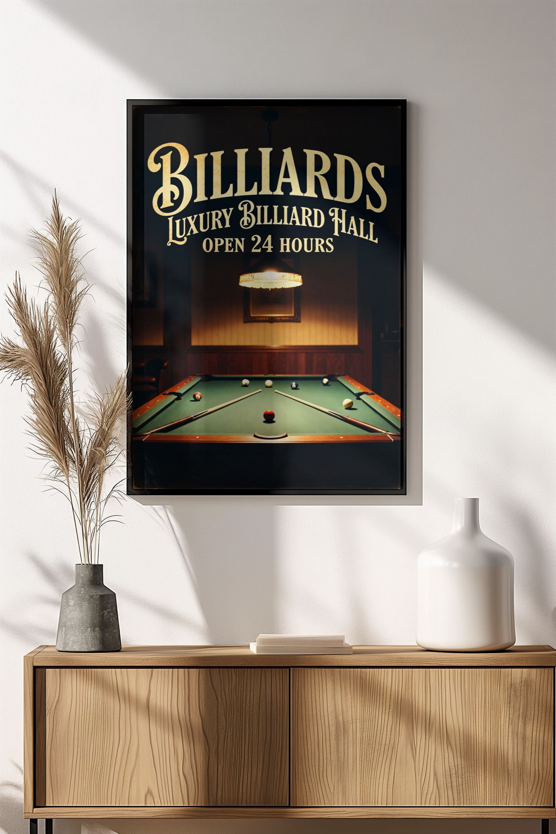 Tunnelmallinen retro-vintage juliste biljardisalista: vihreä pöytä palloineen ja kiekoineen lämpimän lampun valossa, teksti "LUXURY BILLIARD HALL OPEN 24 HOURS". Täydellinen man caveen, pelihuoneeseen tai baariin tuomaan klassista biljarditunnelmaa.