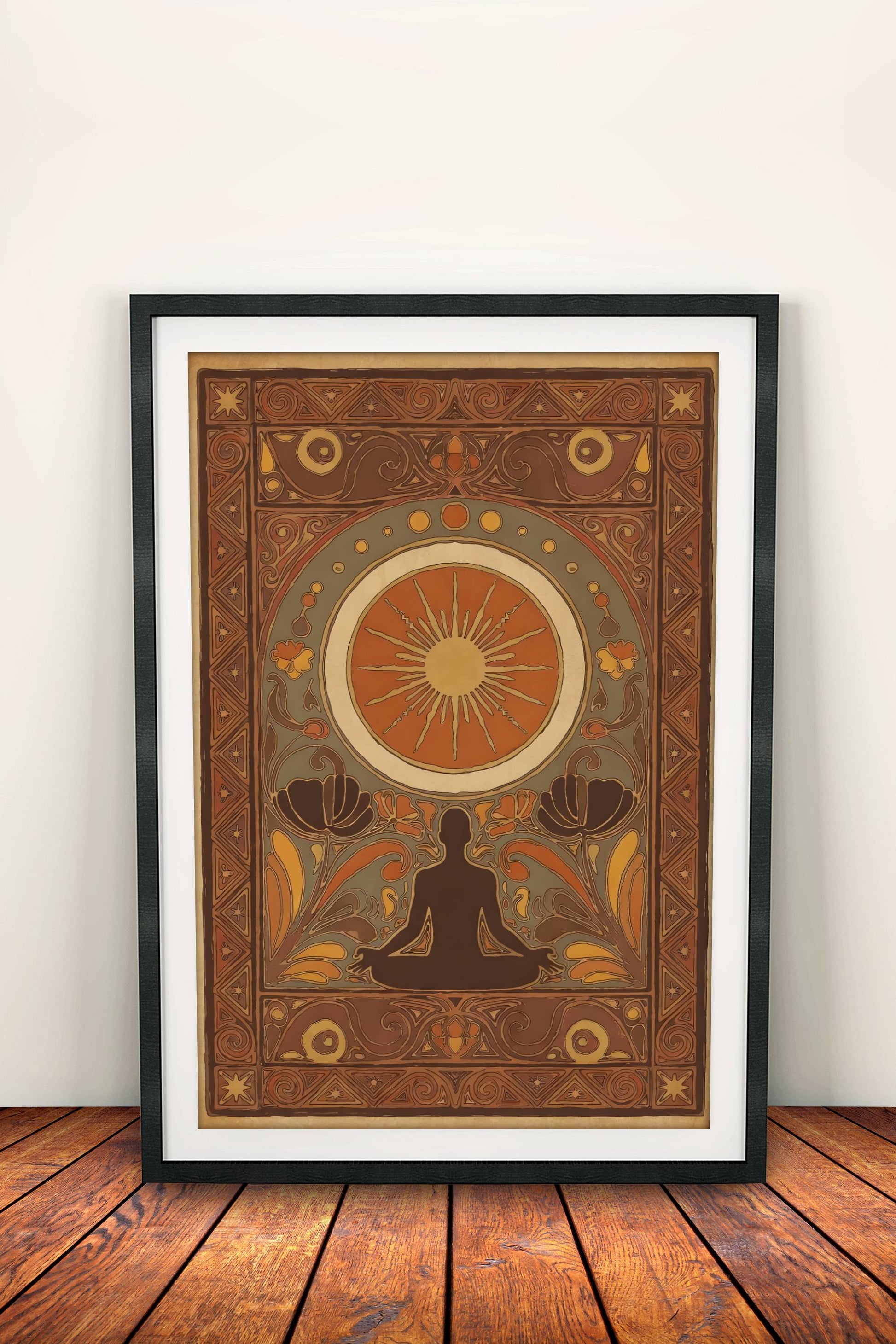 Syvällinen retro-tyylinen meditaatiojuliste lämpimissä ruskean, oranssin ja vihreän sävyissä: istuva siluetti auringon ympyrän alla, ympärillä koristeellisia aaltoja, lehtiä, tähtiä ja mandalamaisia muotoja – kulunut vintage-paperi-ilme tuo rauhaa ja sisäistä voimaa 70-luvun henkisessä hengessä.