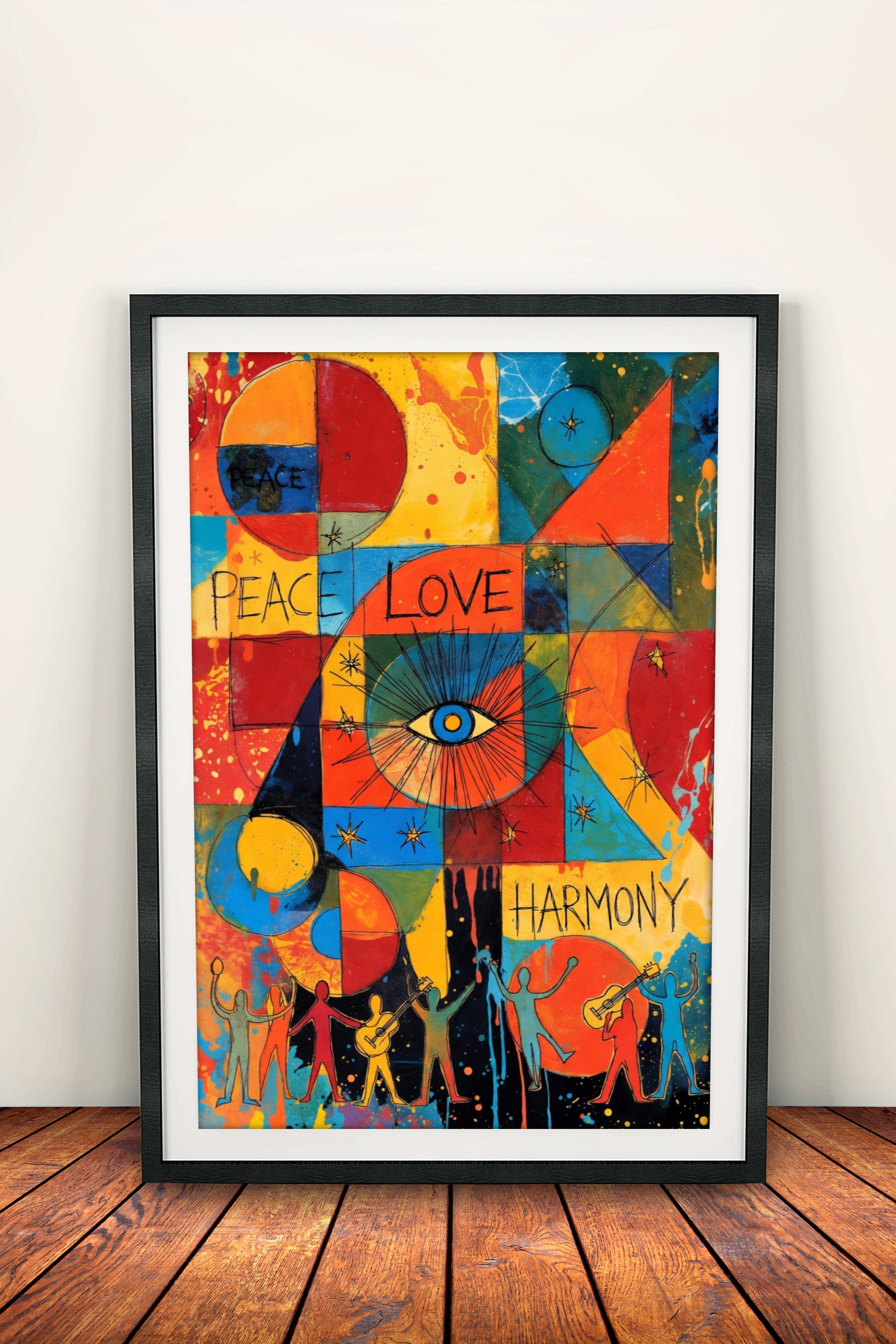 Värikäs retrojuliste kirkkaissa oranssin, sinisen ja vihreän sävyissä: iso silmä keskellä, ympärillä "PEACE LOVE HARMONY" -tekstiä, tanssivia ja soittavia hahmoja, tähtiä ja pisaroivia värejä – 60–70-luvun boheemi tunnelma.