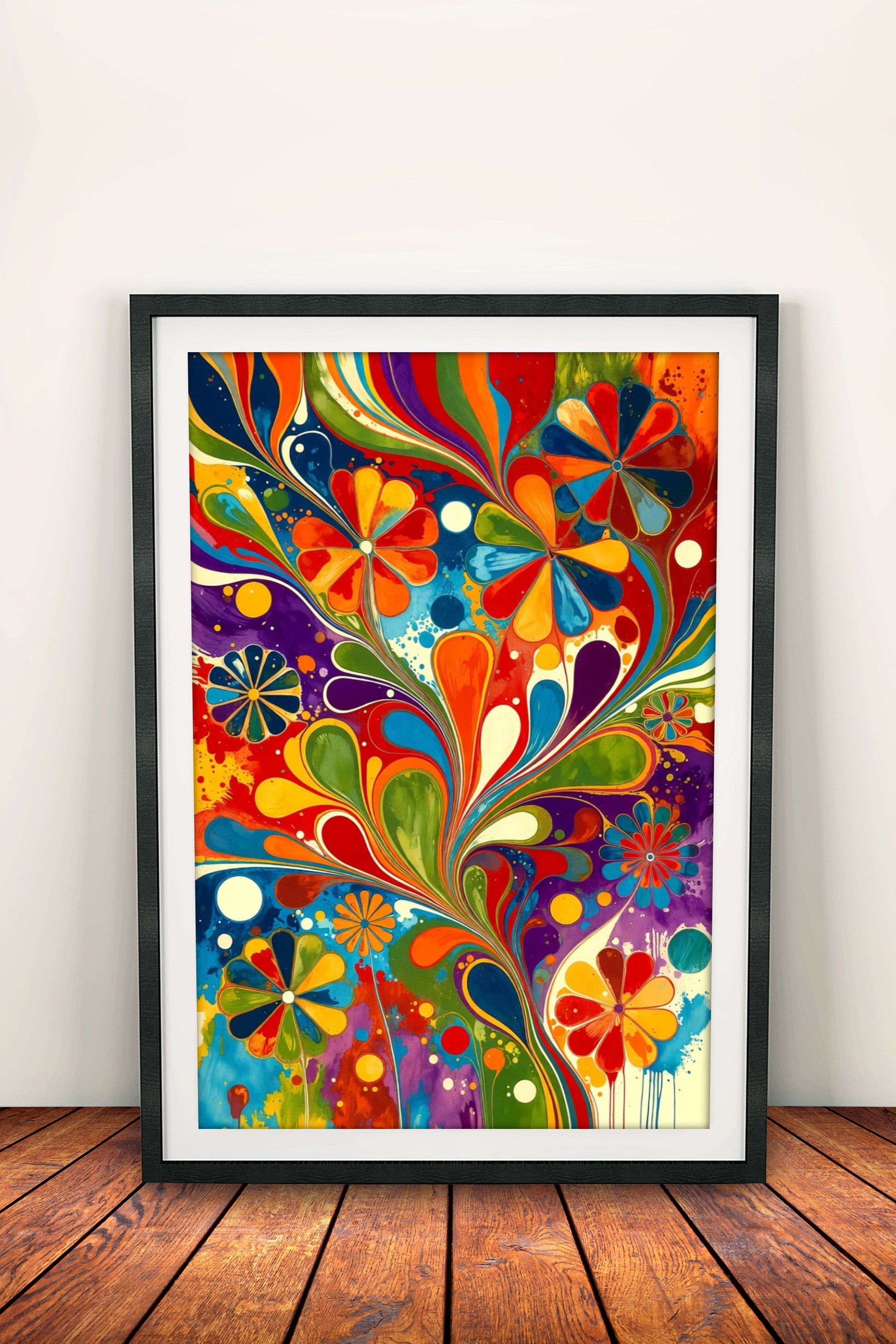 Värikäs retro-vintage juliste kukista: sateenkaaren väreissä virtaavat kukat ja aaltoilevat muodot. Iloinen ja energinen 70-luvun hippityyli – täydellinen boheemiin sisustukseen tai nuorekkaaseen tilaan.
