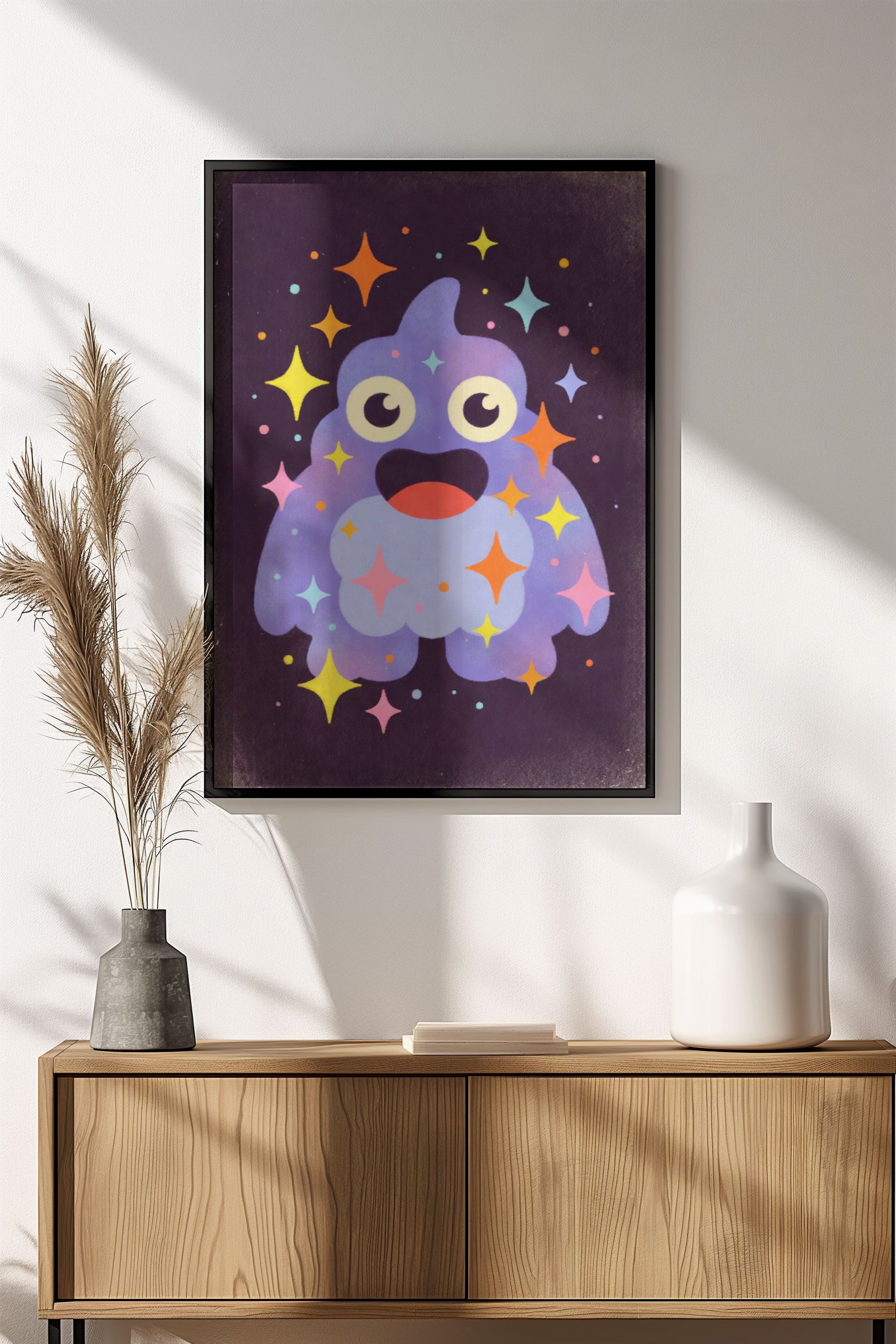 Iloinen retro-vintage juliste suloisesta sinisestä monsterista, jota ympäröivät värikkäät kimaltelevat tähdet. Hauska ja ystävällinen hahmo tuo lastenhuoneeseen leikkisää taikaa ja iloista tunnelmaa.