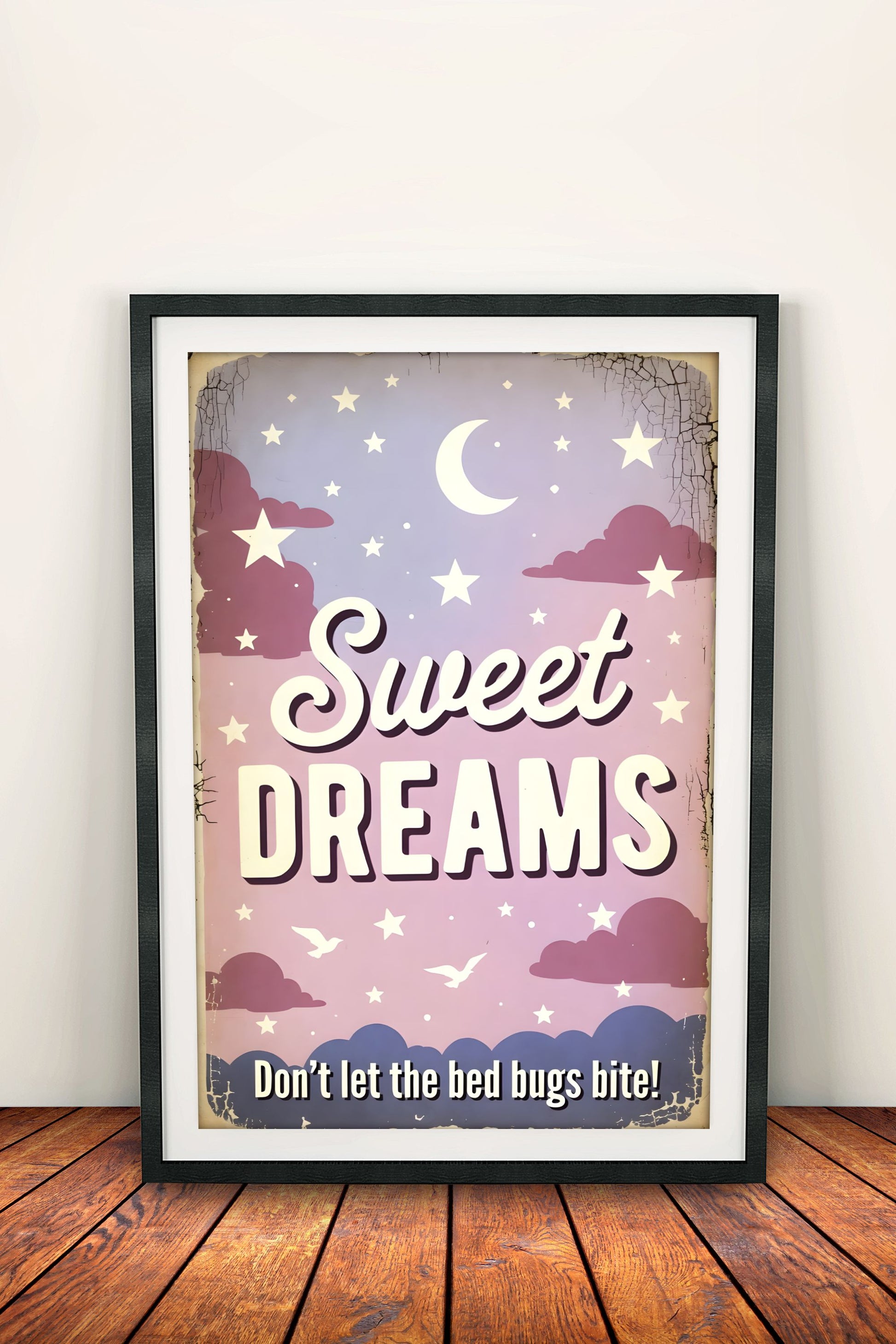 Ihastuttava retro vintage -juliste unelmista ja hyttysten torjunnasta: pastellinsävyinen taivas, kuu, tähdet ja pilvet sekä klassinen "Don't let the bed bugs bite" -toivotus. Tuo lempeää ja hauskaa tunnelmaa lasten makuuhuoneeseen, vauvan huoneeseen tai rentoon sisustukseen. Vanhahtava patina tekee siitä täydellisen nostalgisen yöunijulisteen.