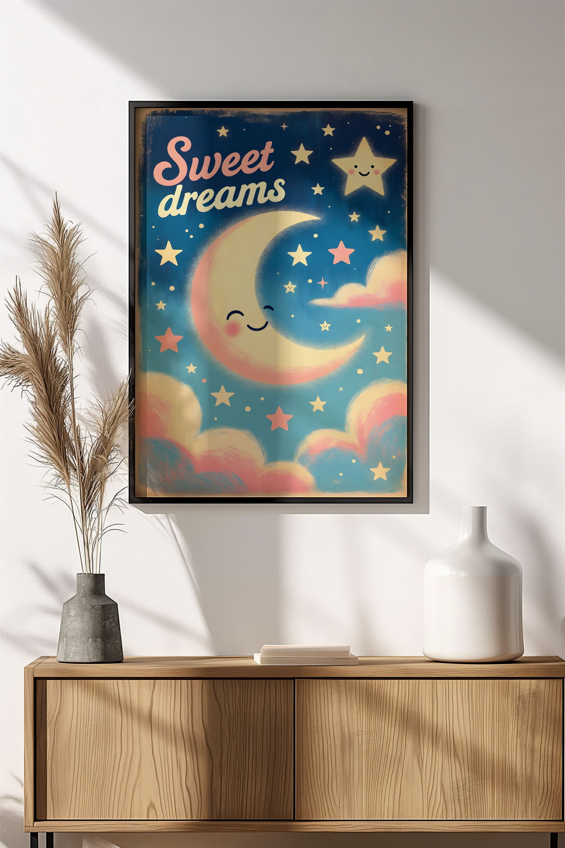 Suloinen retro vintage -juliste hymyilevällä kuulla ja tähdillä – "Sweet Dreams" -teksti tuo unelmia ja rauhallista tunnelmaa. Täydellinen lasten makuuhuoneeseen, vauvan huoneeseen tai kevyeen sisustukseen. Vanhahtava patina ja lempeät värit tekevät tästä ihanan nukkumaanmenijulisteen.