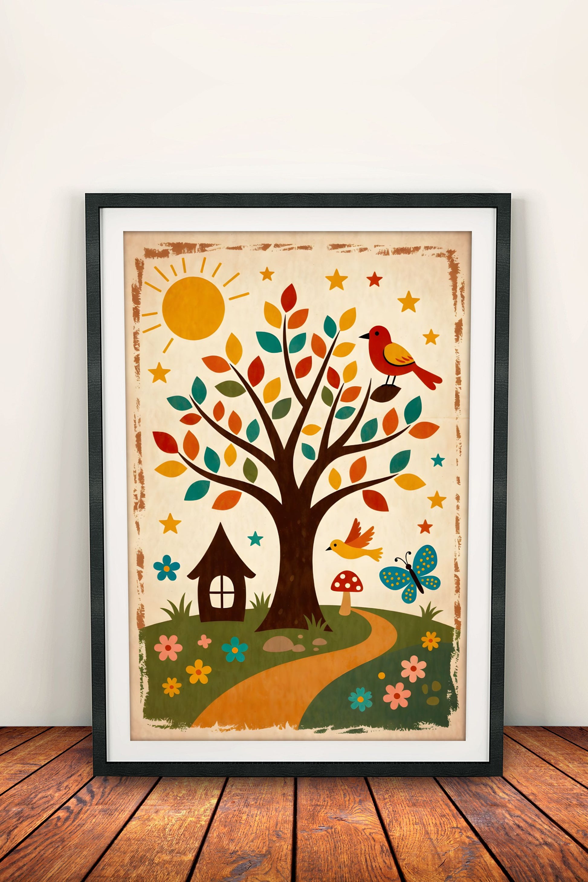Iloinen retro vintage -juliste elämänpuusta, linnuista, perhosesta ja pienestä talosta – aurinko, tähdet ja värikkäät lehdet luovat lämpimän ja leikkisän tunnelman. Täydellinen lastenhuoneeseen, päiväkotiin, mökille tai iloiseen sisustukseen. Nostalginen ja pirteä valinta retrohenkiseen kotiin.