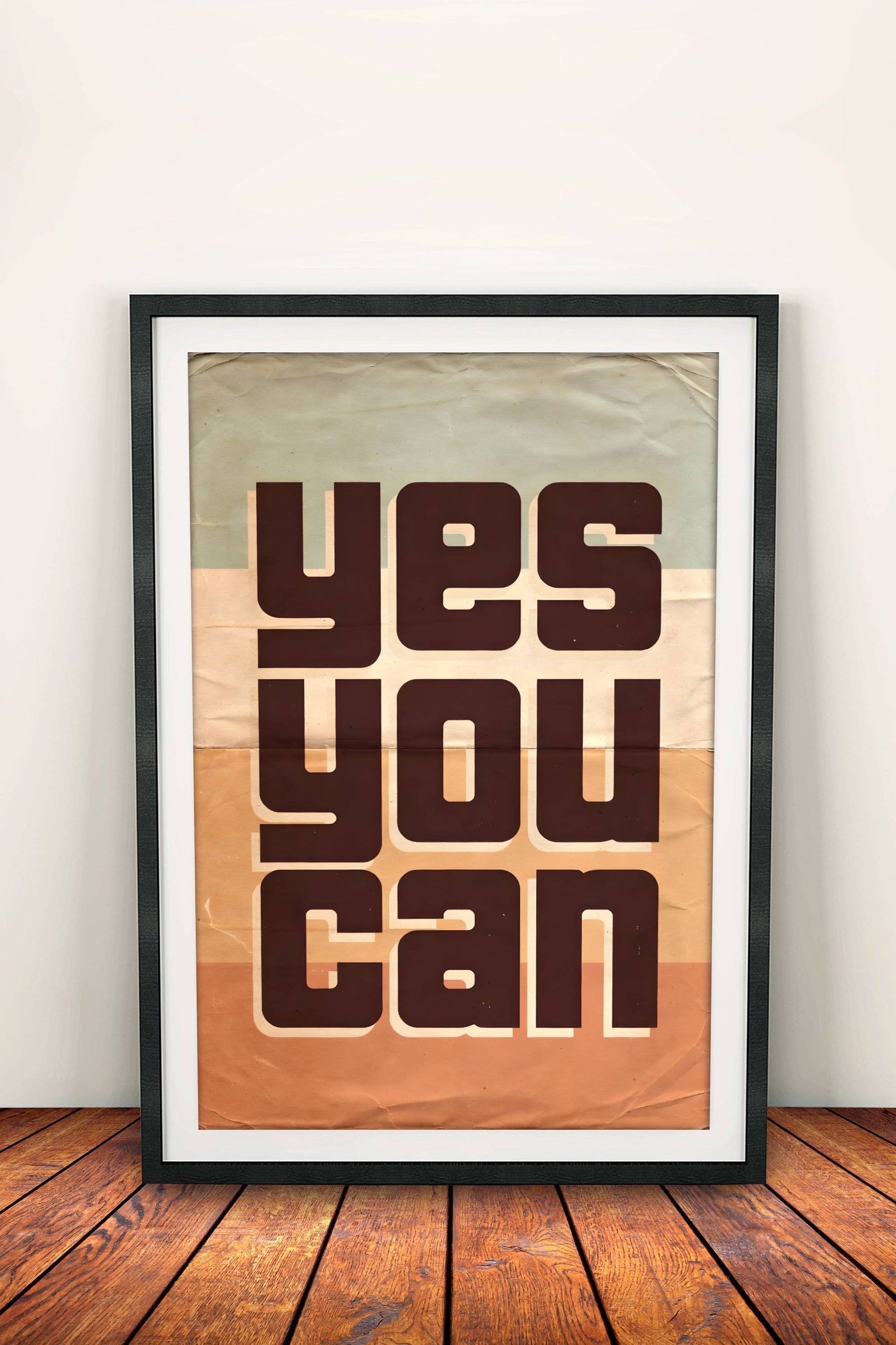Voimakas retro-tyylinen motivaatiojuliste kuluneella paperi-ilmeellä: iso ruskea "YES YOU CAN" -teksti toistuen suurina kirjaimina, taustalla vaalea vihreä ja oranssi raidat – klassinen 70-luvun kannustusviesti ilman turhia koristeita.